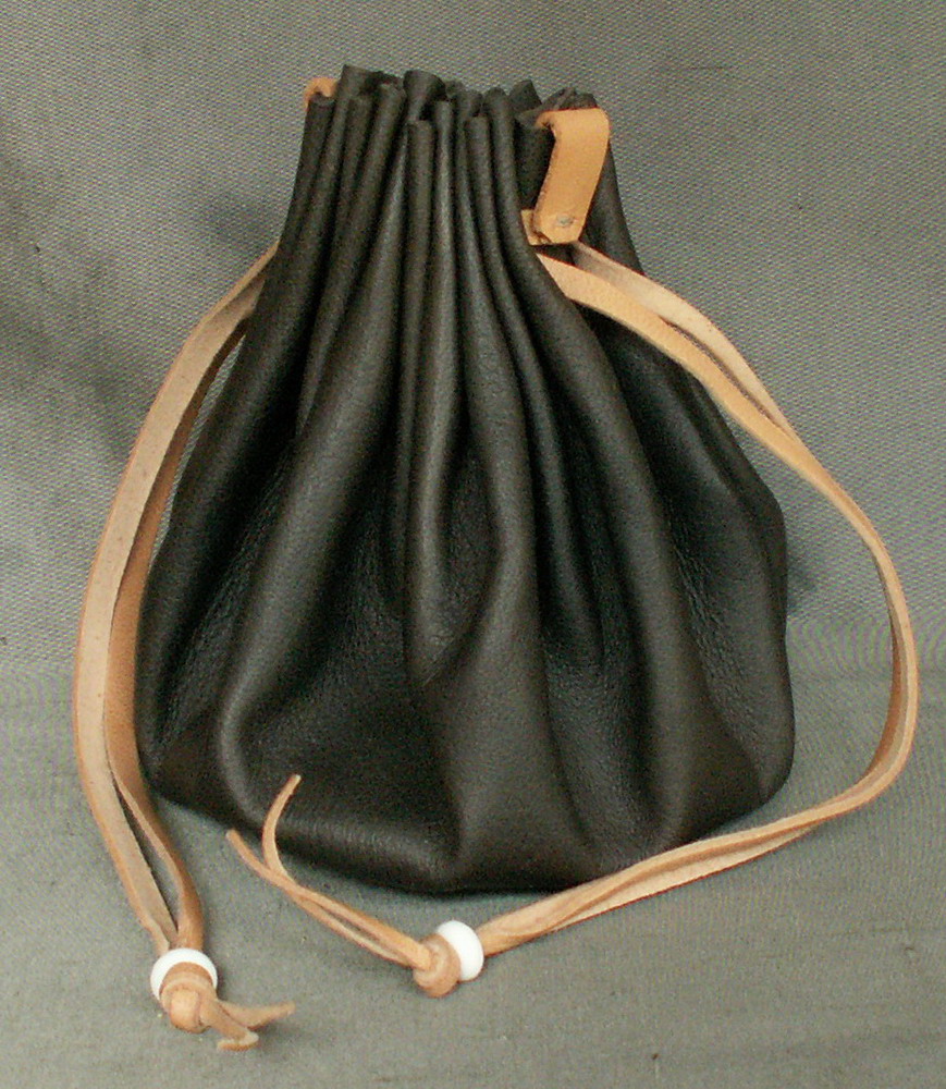 This purse is made from oak gall black goat skin and is made by hand. It is held closed with double leather drawstrings that have small tags attached which makes it easier to open the purse.