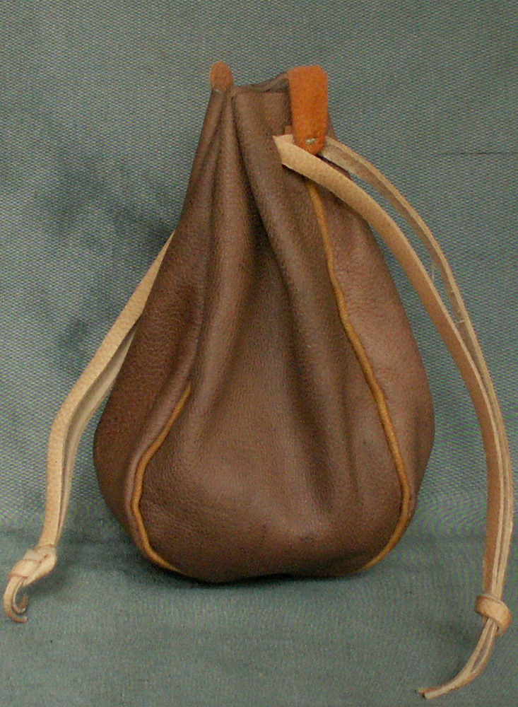 This purse is made from brown goat skin with tan piping and is stitched by hand. It is held closed with double leather drawstrings that have small tags attached which makes it easier to open the purse.