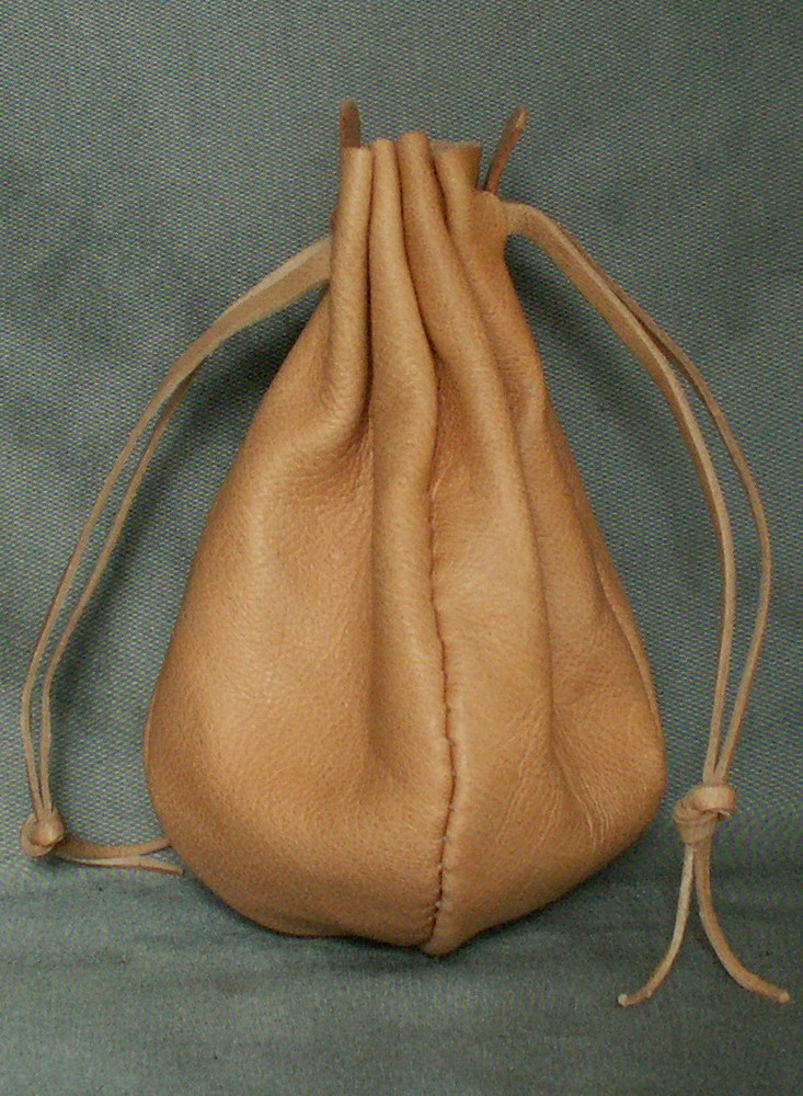 This purse is made from tan goat skin and is stitched by hand. It is held closed with double leather drawstrings that have small tags attached which makes it easier to open the purse.