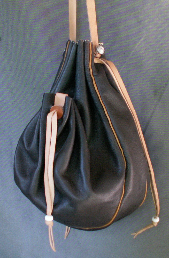 This purse is made from oak gall black goat skin with tan piping and a gusset and is stitched by hand. The design is based on a figure in "The Wedding Dance In The Open Air" by Pieter Bruegel painted in 1556 and was a common style in the 16th and 17th centuries. It hangs from a leather cord and the top is held closed by two leather draw strings which have hand made beads on the ends.