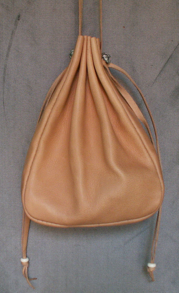 This purse is made from tan goat skin and is stitched by hand. The design for this purse comes from illustrations in "Musicerend paar" by Lucas van Leyden - 1524 and was a common style in the 15th and 16th centuries. It hangs from a leather cord and the top is held closed by two leather draw strings which have hand made beads on the ends.