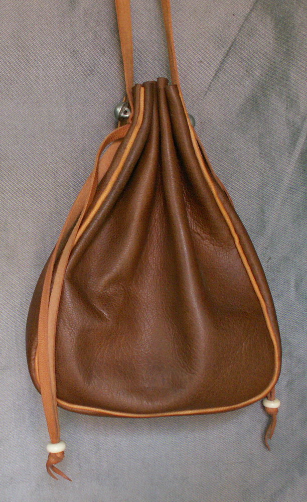This purse is made from brown goat skin with tan piping and is stitched by hand. The design for this purse comes from illustrations in "Musicerend paar" by Lucas van Leyden - 1524 and was a common style in the 15th and 16th centuries. It hangs from a leather cord and the top is held closed by two leather draw strings which have hand made beads on the ends.