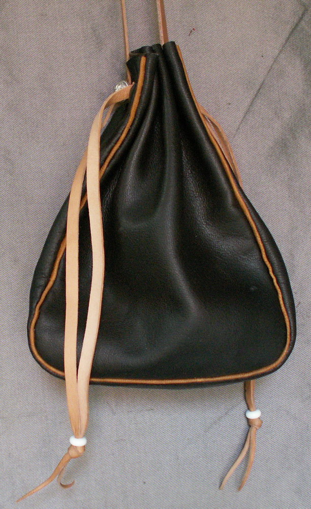 This purse is made from oak gall black goat skin with tan piping and is stitched by hand. The design for this purse comes from illustrations in "Musicerend paar" by Lucas van Leyden - 1524 and was a common style in the 15th and 16th centuries. It hangs from a leather cord and the top is held closed by two leather draw strings which have hand made beads on the ends.