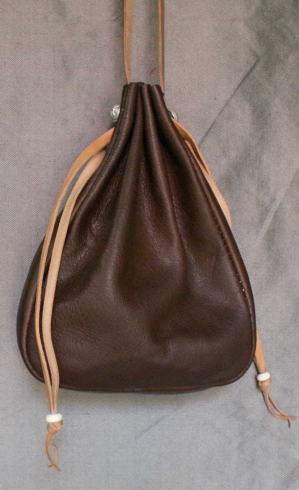 This purse is made from brown goat skin and is stitched by hand. The design for this purse comes from illustrations in "Musicerend paar" by Lucas van Leyden - 1524 and was a common style in the 15th and 16th centuries. It hangs from a leather cord and the top is held closed by two leather draw strings which have hand made beads on the ends.