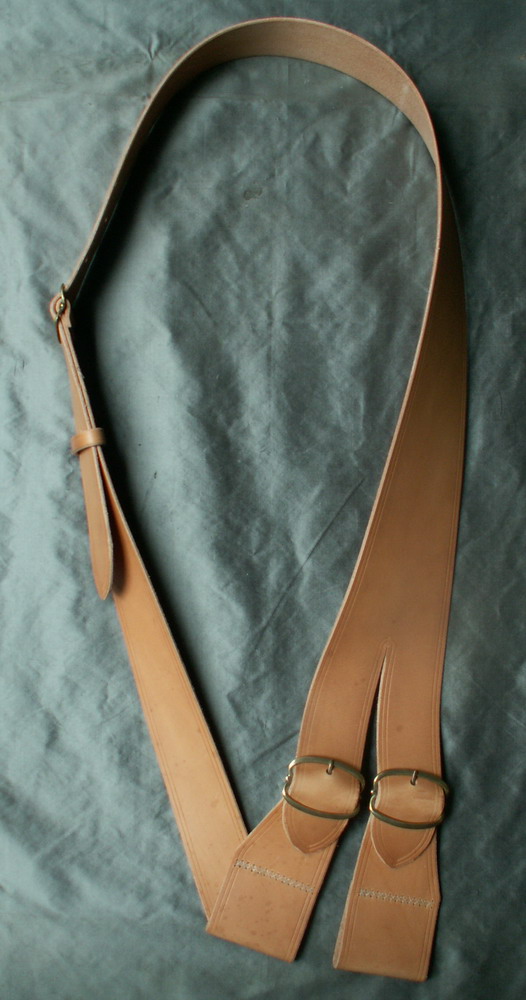 This baldric is made from tan cattle hide and is stitched by hand. The design comes from a painting of Charles II Dancing at a Ball at Court 1660 by Hieronymus Janssens. It has three large brass buckles that allows the length to be adjusted and the seams are stitched with a decorative cross stitch.