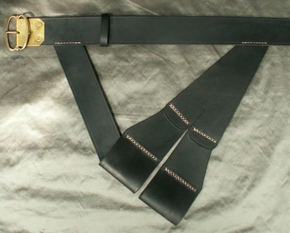 This sword hanger is made from oak gall black cattle hide that has been dyed using period dyes and is made entirely by hand. The design for this hanger is based on a surviving example in the Royal Armouries Museum in Leeds. It has a brass buckle with a buckle plate and the seams are stitched with a decorative cross stitch.