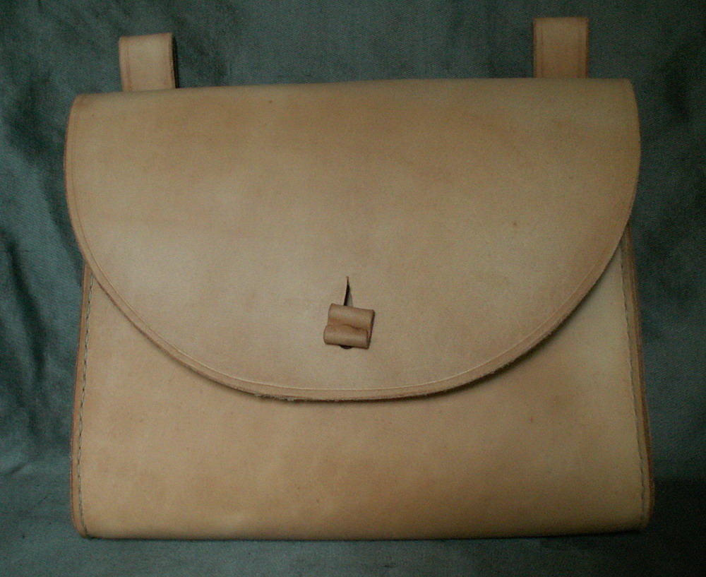 This belt wallet is made from tan calf skin and is stitched by hand. It has side gussets that are 1 1/2 inches wide to give it extra room inside. The design is based on a number of 16th and 17th century illustrations and is a common design in that period.