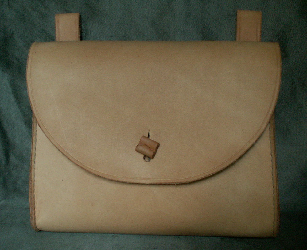 This belt wallet is made from tan calf skin and is stitched by hand. It has side gussets that are 1 1/2 inches wide to give it extra room inside. The design is based on a number of 16th and 17th century illustrations and is a common design in that period.