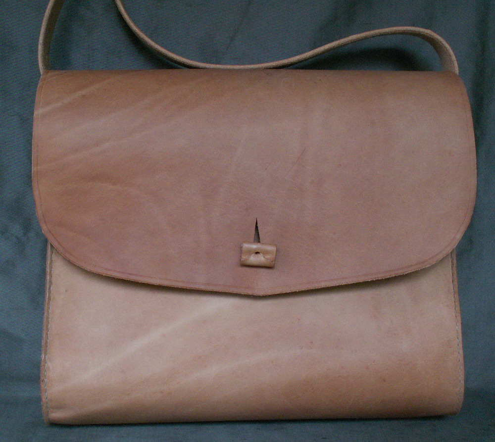 This shoulder bag is made from tan calf skin and is stitched by hand. The design for this bag comes from a number of illustrations and is a typical style of shoulder bag between the 14th and 17th centuries. It has gussets stitched into the sides which gives more room inside the bag.
