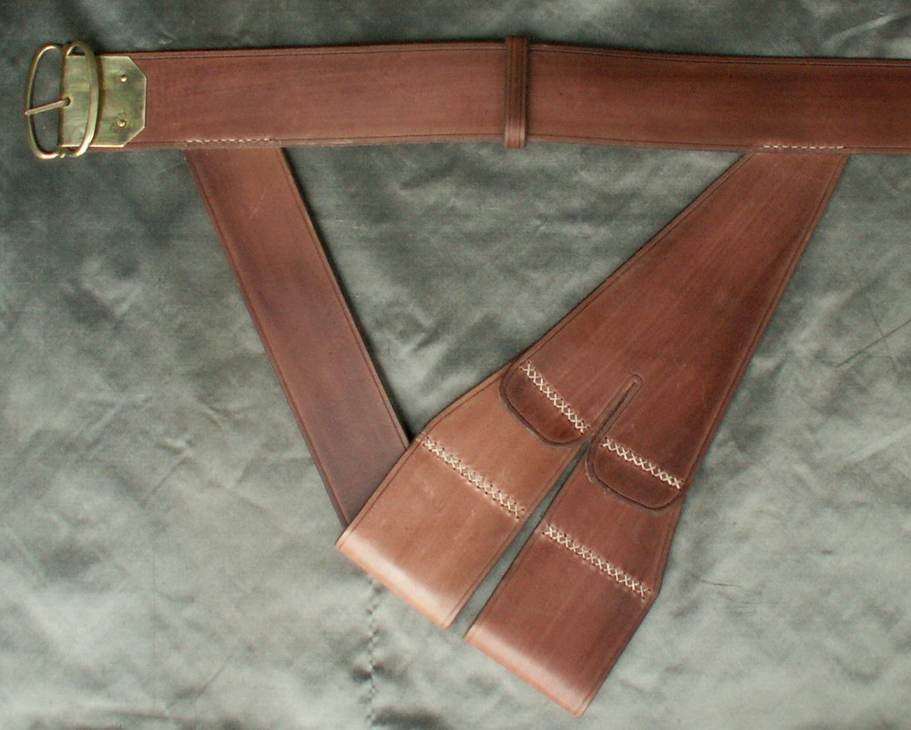 This sword hanger is made from dark brown cattle hide that has been dyed using period dyes and is made entirely by hand. The design for this hanger is based on a surviving example in the Royal Armouries Museum in Leeds. It has a brass buckle with a buckle plate and the seams are stitched with a decorative cross stitch.
