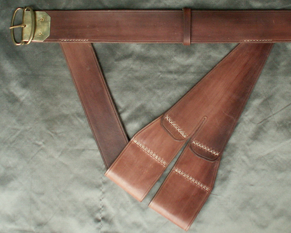 This sword hanger is made from dark brown cattle hide that has been dyed using period dyes and is made entirely by hand. The design for this hanger is based on a surviving example in the Royal Armouries Museum in Leeds. It has a brass buckle with a buckle plate and the seams are stitched with a decorative cross stitch.