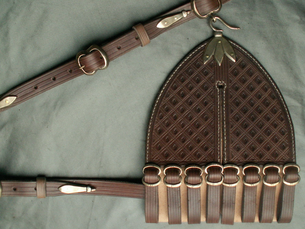 This sword hanger is made from brown calf and cattle hide that has been dyed using period dyes and is made entirely by hand. The design for this hanger comes from a number of 16th and 17th century illustrations and surviving examples notably a surviving leather hanger in the Royal Armouries Museum in Leeds. It has cast bronze fittings with an adjustable waist belt and suspension strap and the suspension points can be moved to balance the sword correctly. It is highly decorated with incised lines and stamped tooling.