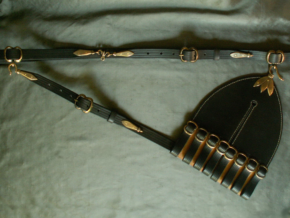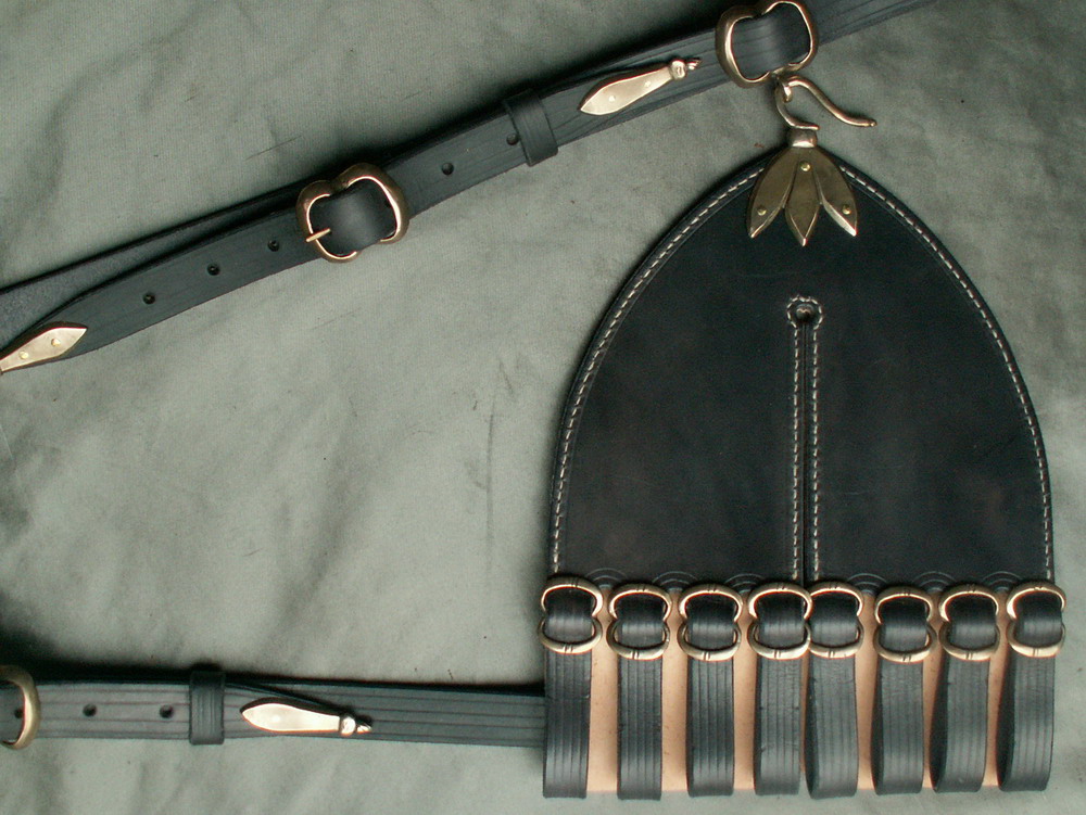 This sword hanger is made from oak gall black calf and cattle hide that has been dyed using period dyes and is made entirely by hand. The design for this hanger comes from a number of 16th and 17th century illustrations and surviving examples notably a surviving leather hanger in the Royal Armouries Museum in Leeds. It has cast bronze fittings with an adjustable waist belt and suspension strap and the suspension points can be moved to balance the sword correctly. The straps are decorated with incised lines.