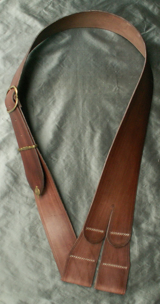 This baldric is made from brown cattle hide and is stitched by hand. The design for this baldric comes from a portrait of Col Thomas St Aubyn dated 1641. It has a large ornate brass buckle, keeper and strap end that allows the length to be adjusted and the seams are stitched with a decorative cross stitch.