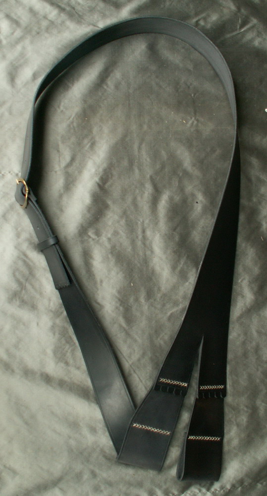 This baldric is made from oak gall black cattle hide and is stitched by hand. The design comes from a number of 17th century illustrations and surviving examples notably a cavalry troopers buff leather baldric in the Royal Armouries Museum in Leeds. It has a brass buckle and keeper that allows the length to be adjusted, all the seams are cross stitched and the ends of the straps are scalloped.