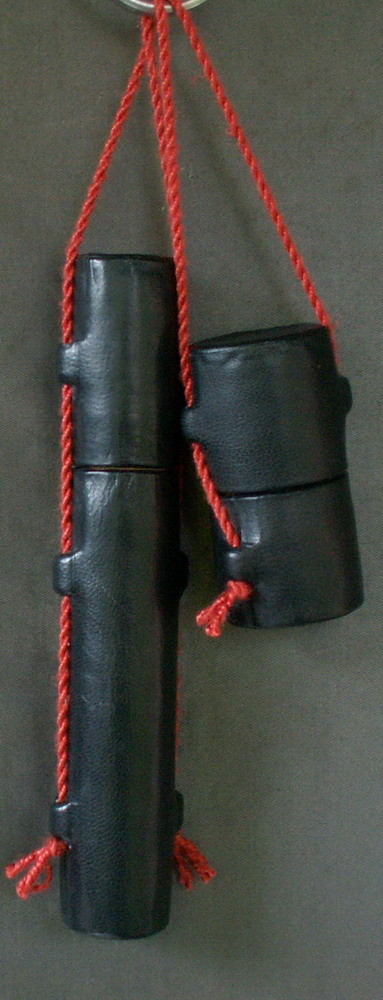 This penner is made from oak gall black goat and calf skin and is made by hand. The design comes from illustrations in paintings and prints as well as a number of surviving examples. It is laced together with madder dyed silk cords and comes complete with two goose quill pens.