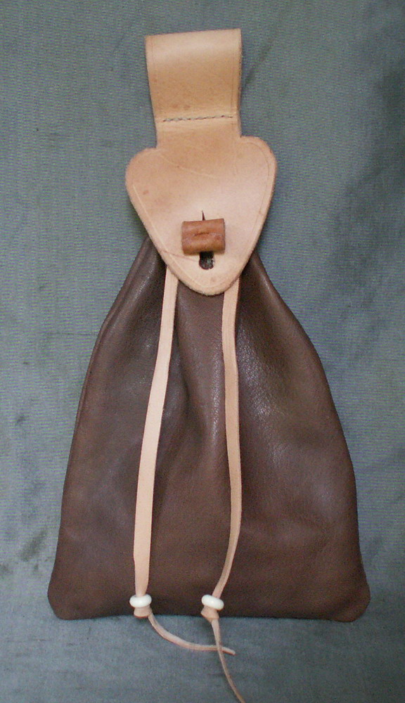 This belt bag is made from brown goat and tan calf skin and is stitched by hand. The design is taken from a surviving example found on the wreck of the Mary Rose and and is a common style in the 15th and 16th century. It has a draw string bag that is held closed with a button flap and hangs from a belt loop. The drawstrings have hand made beads on the ends.