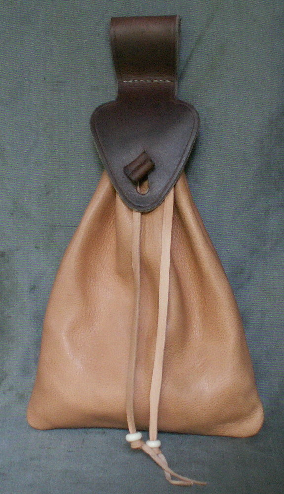 This belt bag is made from tan goat and brown calf skin and is stitched by hand. The design is taken from a surviving example found on the wreck of the Mary Rose and and is a common style in the 15th and 16th century. It has a draw string bag that is held closed with a button flap and hangs from a belt loop. The drawstrings have hand made beads on the ends.