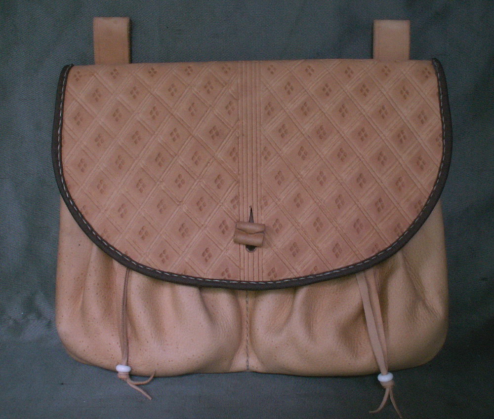This belt wallet is made from tan calf skin and is stitched by hand. It has two additional pouchlets on the front that are kept closed with their own drawstrings. The flap is decorated with a tooling design and the edge is bound with tan leather. The design is based on a number of 16th and 17th century illustrations and is a common design in that period.