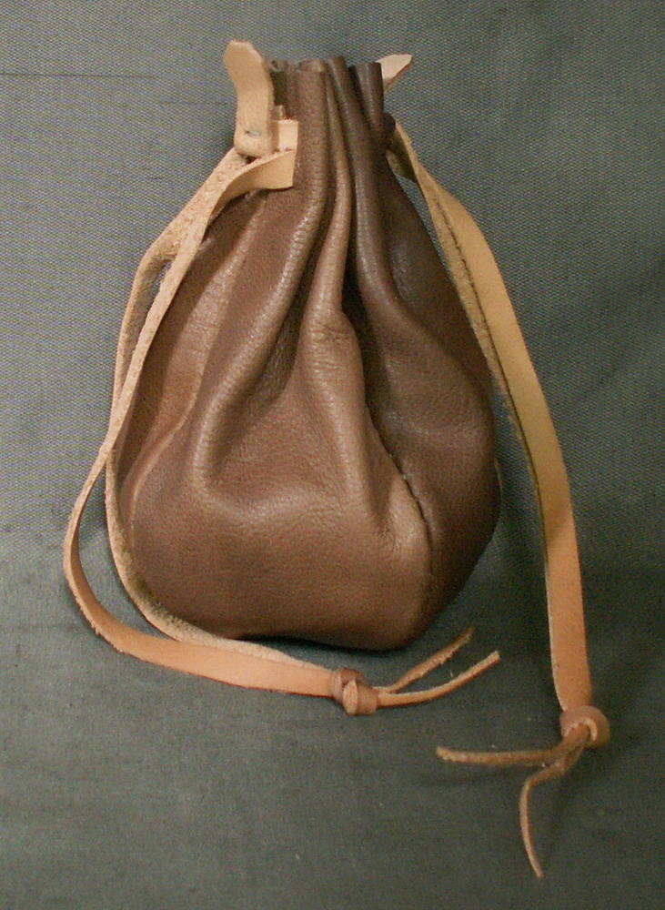 This purse is made from brown goat skin and is stitched by hand. It is held closed with double leather drawstrings that have small tags attached which makes it easier to open the purse.