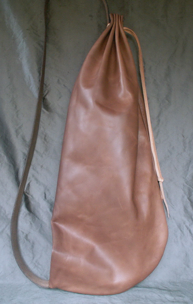 This bag is made from brown goat skin and is stitched by hand. The design for this bag comes from a number of illustrations and is a typical style of shoulder bag between the 14th and 17th centuries. The main seam has a piping strip inserted into it which helps to keep the rain out and the bag is kept closed with a strong leather drawstring and a leather slider.