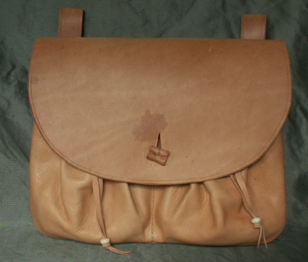 This belt wallet is made from tan calf and goat skin and is stitched by hand. It has two additional pouchlets on the front that are kept closed with their own drawstrings. The design is based on a number of 16th and 17th century illustrations and is a common design in that period.