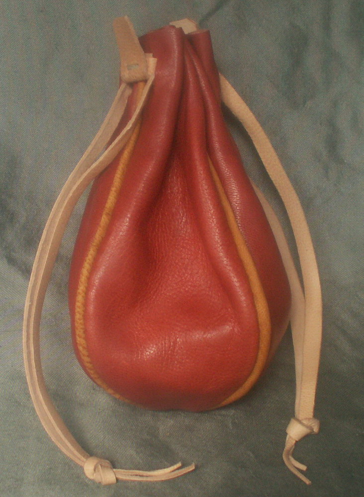 This purse is made from brazilwood red goat skin with tan piping and is stitched by hand. It is held closed with double leather drawstrings that have small tags attached which makes it easier to open the purse.