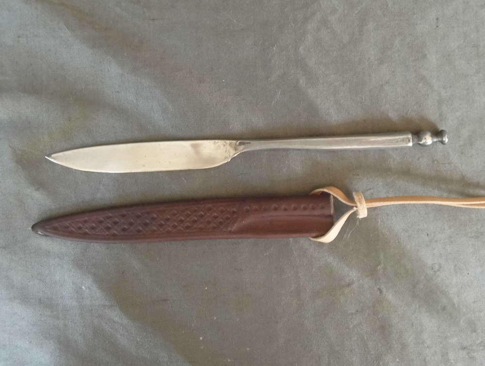 This bolstered eating knife is hand forged and has a steel blade and a wrought iron handle. The sheath is made from brown calf skin that has been wet moulded, stitched by hand and decorated with an incised line and stamped design. It has a leather thong so it can be carried on a belt.