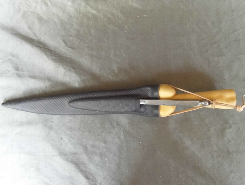 This bollock knife and bolstered eating knife are hand forged. The bollock knife has a boxwood handle and the eating knife has a steel blade and a wrought iron handle. The sheath is made from oak gall black calf skin that has been wet moulded, stitched by hand and decorated with an incised line and stamped design. It has a leather thong so it can be carried on a belt.
