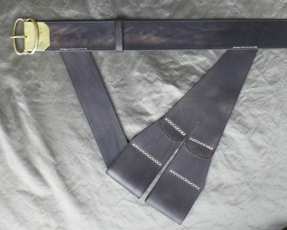 This sword hanger is made from oak gall black cattle hide that has been dyed using period dyes and is made entirely by hand. The design for this hanger is based on a surviving example in the Royal Armouries Museum in Leeds. It has a brass buckle with a buckle plate and the seams are stitched with a decorative cross stitch.