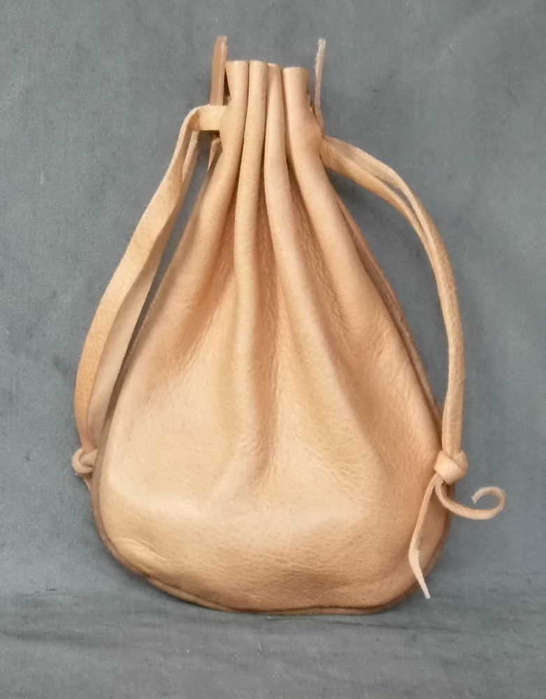 This purse is made from tan goat skin with brown piping and is stitched by hand. It is held closed with double leather drawstrings that have small tags attached which makes it easier to open the purse.
