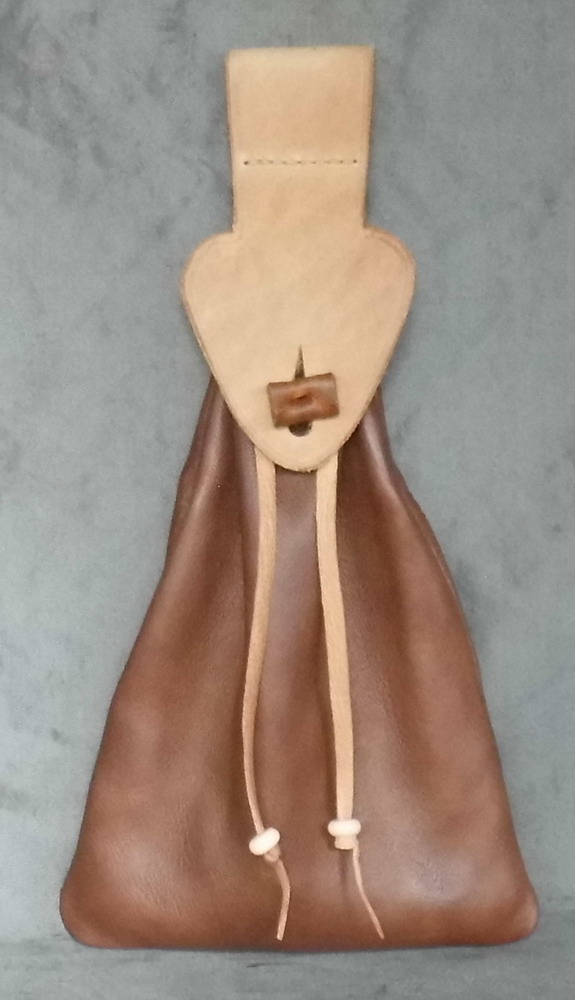 This belt bag is made from brown goat and tan calf skin and is stitched by hand. The design is taken from a surviving example found on the wreck of the Mary Rose and and is a common style in the 15th and 16th century. It has a draw string bag that is held closed with a button flap and hangs from a belt loop. The drawstrings have hand made beads on the ends.
