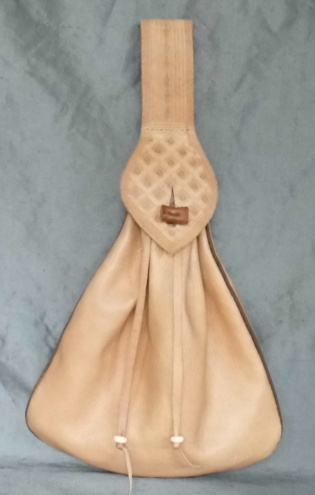 This belt bag is made from tan goat and calf skin with tan piping and is stitched by hand. The design for this bag comes from illustrations in Boccaccio's Decameron 1430 and is a common style in the 15th and 16th century. It has a draw string bag that is held closed with a button flap and hangs from a belt loop. The drawstrings have hand made beads on the ends. The belt loop and button flap are decorated with incised lines and stamped tooling.