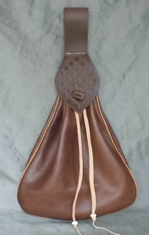 This belt bag is made from brown goat and calf skin with tan piping and is stitched by hand. The design for this bag comes from illustrations in Boccaccio's Decameron 1430 and is a common style in the 15th and 16th century. It has a draw string bag that is held closed with a button flap and hangs from a belt loop. The drawstrings have hand made beads on the ends. The belt loop and button flap are decorated with incised lines and stamped tooling.