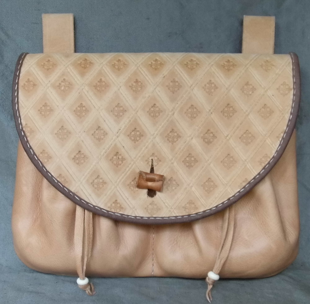 This belt wallet is made from tan calf and goat skin and is stitched by hand. It has two additional pouchlets on the front that are kept closed with their own drawstrings. The flap is decorated with a tooling design and the edge is bound with brown goat skin. The design is based on a number of 16th and 17th century illustrations and is a common design in that period.