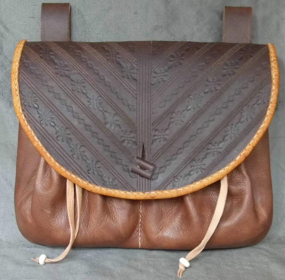 This belt wallet is made from brown calf and goat skin and is stitched by hand. It has two additional pouchlets on the front that are kept closed with their own drawstrings. The flap is decorated with a tooling design and the edge is bound with brown goat skin. The design is based on a number of 16th and 17th century illustrations and is a common design in that period.