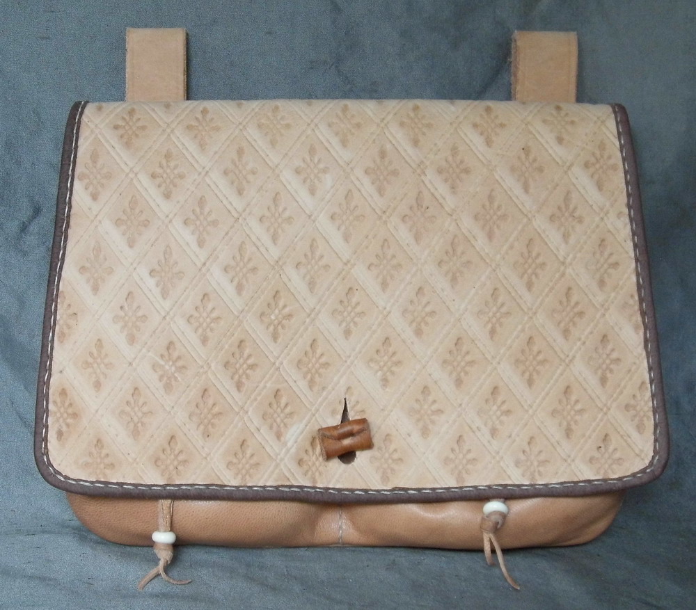 This belt wallet is made from tan calf and goat skin and is stitched by hand. It has two additional pouchlets on the front that are kept closed with their own drawstrings. The flap is decorated with a tooling design and the edge is bound with tan goat skin. The design is based on a number of 16th and 17th century illustrations and is a common design in that period.