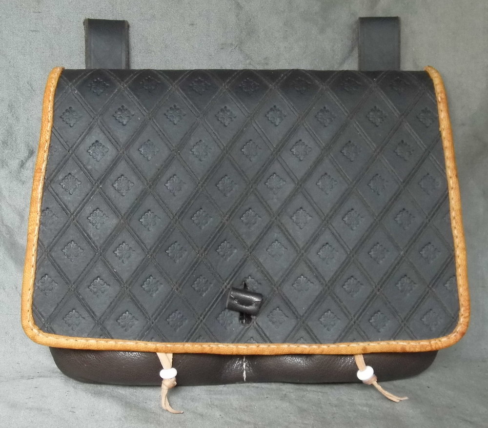 This belt wallet is made from oak gall black calf and goat skin and is stitched by hand. It has two additional pouchlets on the front that are kept closed with their own drawstrings. The flap is decorated with a tooling design and the edge is bound with tan goat skin. The design is based on a number of 16th and 17th century illustrations and is a common design in that period.