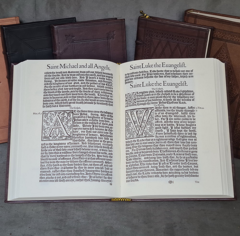 This facsimile book is covered with brown goat skin leather and is made by hand in the same way as they where in the 16th and 17th centuries. It has black and yellow headbands that reinforce the top and bottom of the spine. The paper is a high quality laid paper that has no water marks and there are 455 pages. The covers and spine are decorated with a blind tooling design copied from surviving examples from the same period as this was originally printed