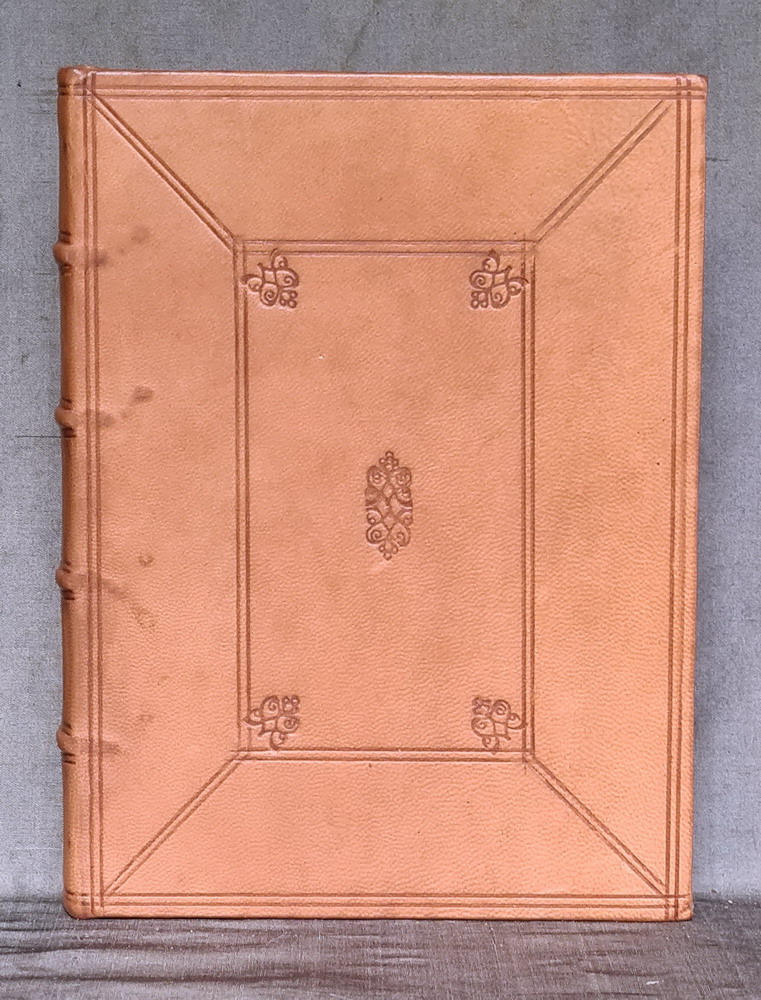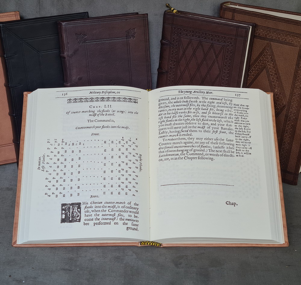 This facsimile book is covered with tan goat skin leather and is made by hand in the same way as they where in the 16th and 17th centuries. It has black and yellow headbands that reinforce the top and bottom of the spine. The paper is a high quality laid paper that has no water marks and there are 360 pages. There are three fold out correction pages that where added after binding to the original copy of this book. The covers and spine are decorated with a blind tooling design copied from surviving examples from the same period as this was originally printed