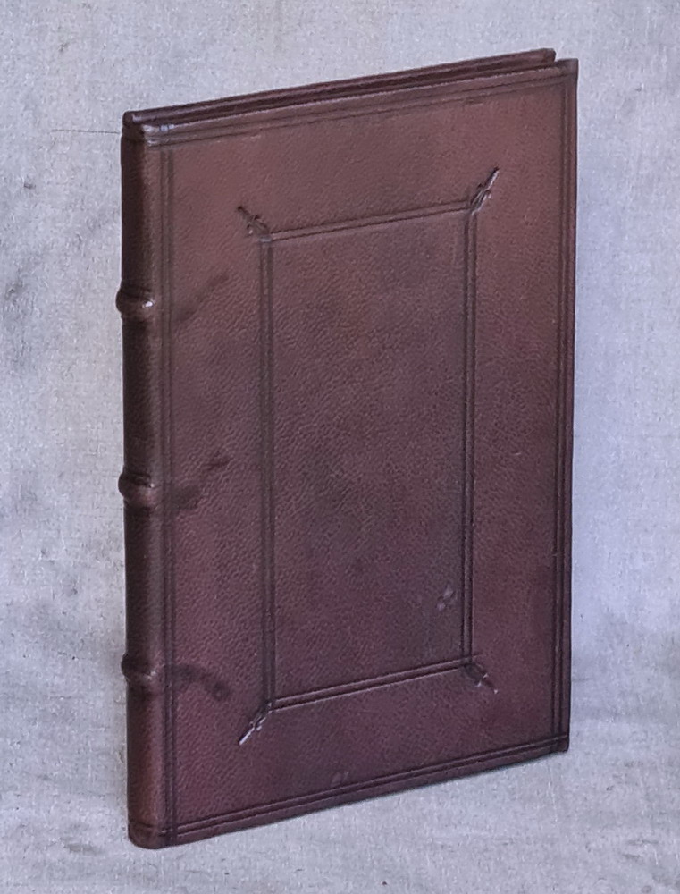 This facsimile book is covered with brown goat skin leather and is made by hand in the same way as they where in the 16th and 17th centuries. It has black and yellow headbands that reinforce the top and bottom of the spine. The paper is a high quality laid paper that has no water marks and there are 80 pages. The covers and spine are decorated with a blind tooling design copied from surviving examples from the same period as this was originally printed