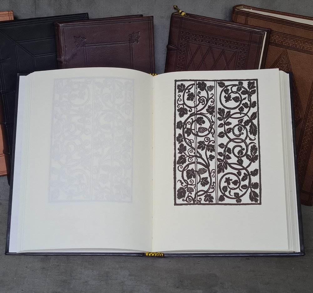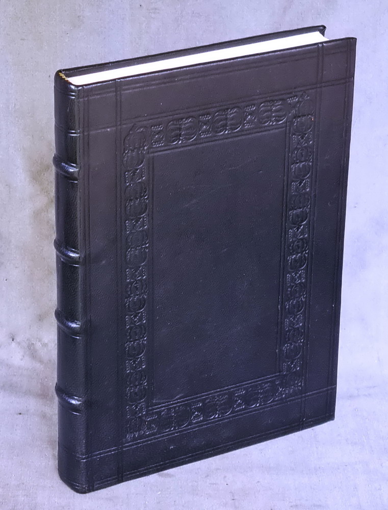 This facsimile book is covered with oak gall black goat skin leather and is made by hand in the same way as they where in the 16th and 17th centuries. It has black and yellow headbands that reinforce the top and bottom of the spine. The paper is a high quality laid paper that has no water marks and there are 255 pages. The covers and spine are decorated with a blind tooling design copied from surviving examples from the same period as this was originally printed