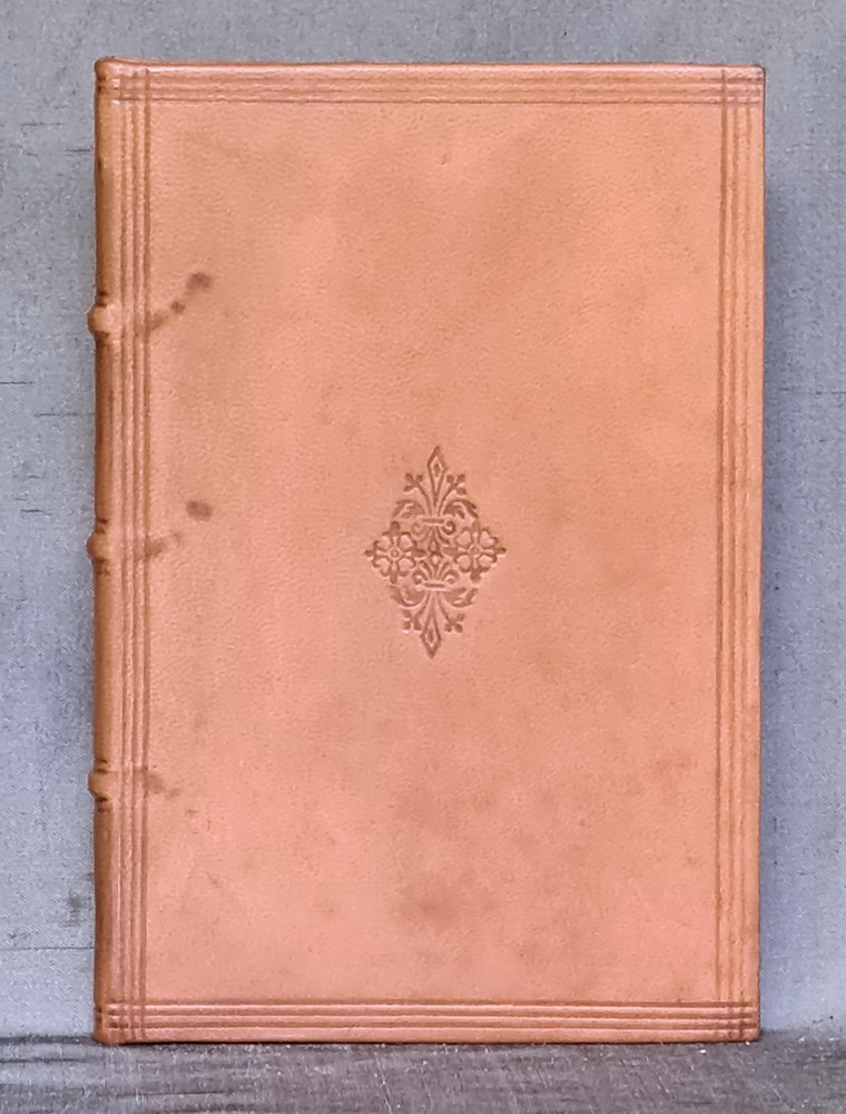 This facsimile book is covered with tan goat skin leather and is made by hand in the same way as they where in the 16th and 17th centuries. It has black and yellow headbands that reinforce the top and bottom of the spine. The paper is a high quality laid paper that has no water marks and there are 120 pages. The covers and spine are decorated with a blind tooling design copied from surviving examples from the same period as this was originally printed