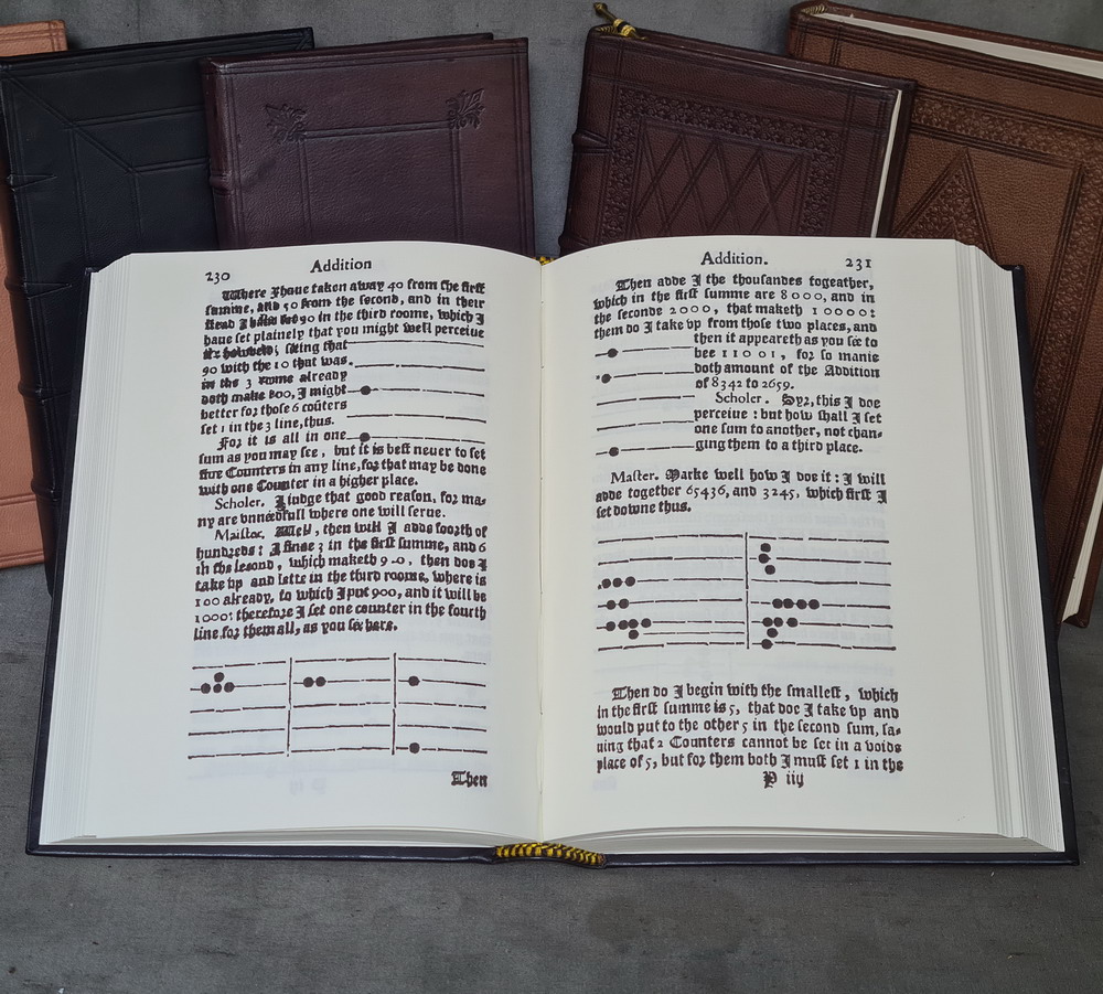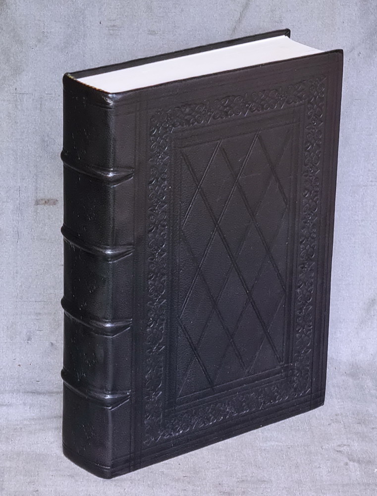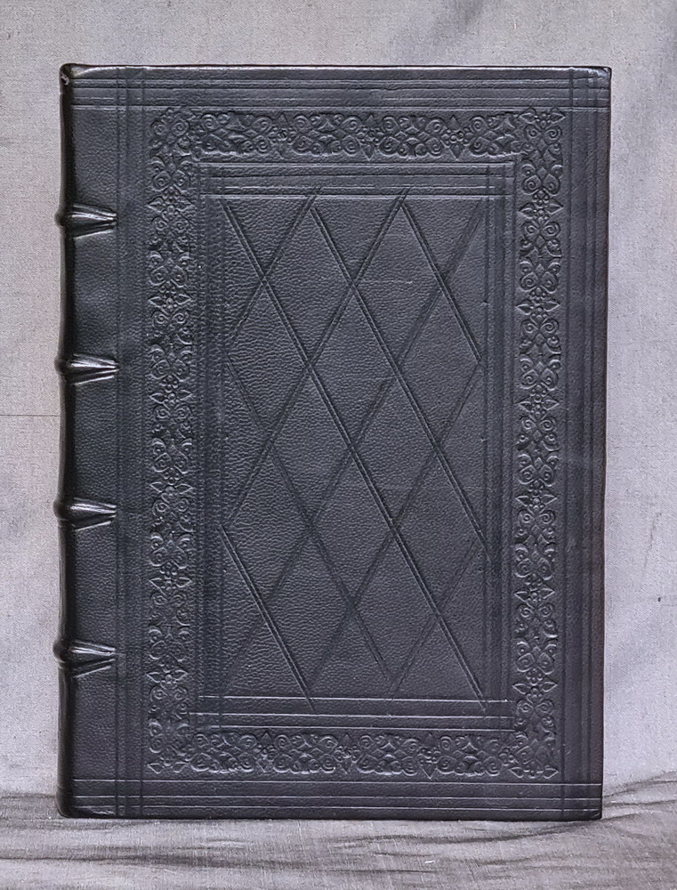 This facsimile book is covered with oak gall black goat skin leather and is made by hand in the same way as they where in the 16th and 17th centuries. It has black and yellow headbands that reinforce the top and bottom of the spine. The paper is a high quality laid paper that has no water marks and there are 560 pages. The covers and spine are decorated with a blind tooling design copied from surviving examples from the same period as this was originally printed