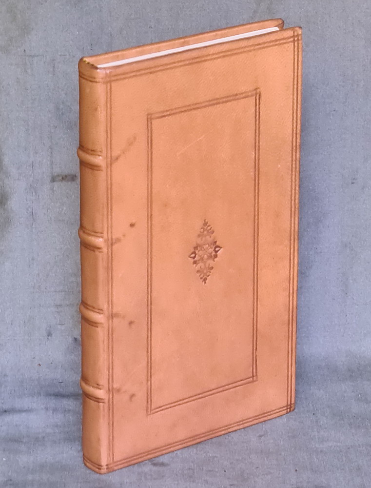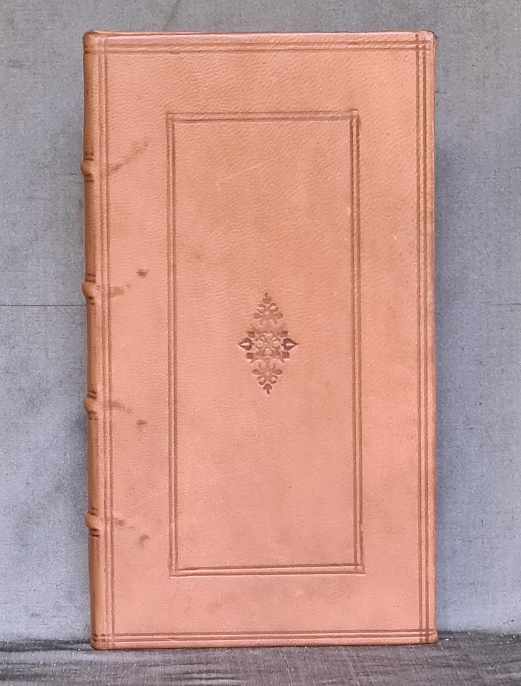 This facsimile book is covered with tan goat skin leather and is made by hand in the same way as they where in the 16th and 17th centuries. It has black and yellow headbands that reinforce the top and bottom of the spine. The paper is a high quality laid paper that has no water marks and there are 170 pages. The covers and spine are decorated with a blind tooling design copied from surviving examples from the same period as this was originally printed
