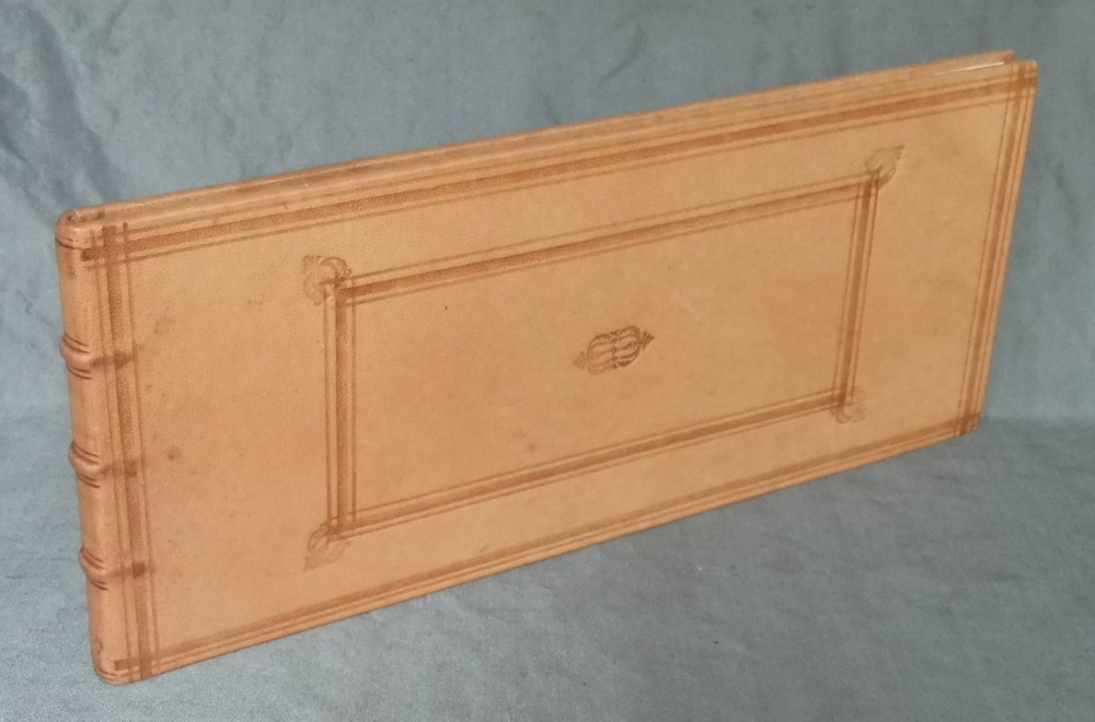 This facsimile book is covered with tan goat skin leather and is made by hand in the same way as they where in the 16th and 17th centuries. It has black and yellow headbands that reinforce the top and bottom of the spine. The paper is a high quality laid paper that has no water marks and there are 72 pages. The covers and spine are decorated with a blind tooling design copied from surviving examples from the same period as this was originally printed