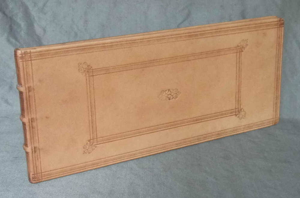 This facsimile book is covered with tan goat skin leather and is made by hand in the same way as they where in the 16th and 17th centuries. It has black and yellow headbands that reinforce the top and bottom of the spine. The paper is a high quality laid paper that has no water marks and there are 72 pages. The covers and spine are decorated with a blind tooling design copied from surviving examples from the same period as this was originally printed