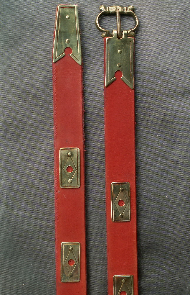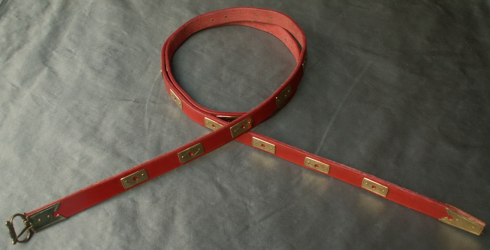 This is a medieval style belt with a brazilwood red 3/4 inch (2cm) wide strap. It is 60 inches (152cm) long with hand made brass buckle plate, strap end and twenty four decorative belt mounts. This style of buckle was in common use from 1250 - 1400