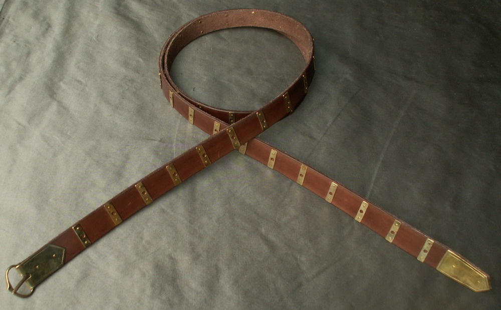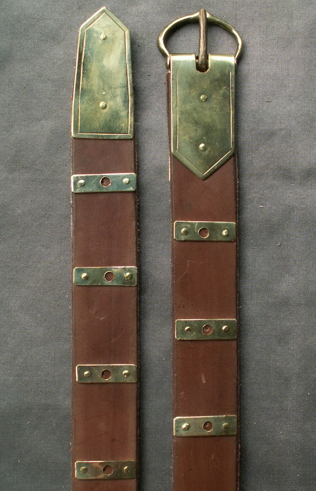 This is a medieval style belt with an brown 7/8 inch (22mm) wide strap. It is 60 inches (152cm) long with hand made brass buckle plate, strap end and fourty two decorative belt mounts. This style of buckle was in common use from 1350 - 1450