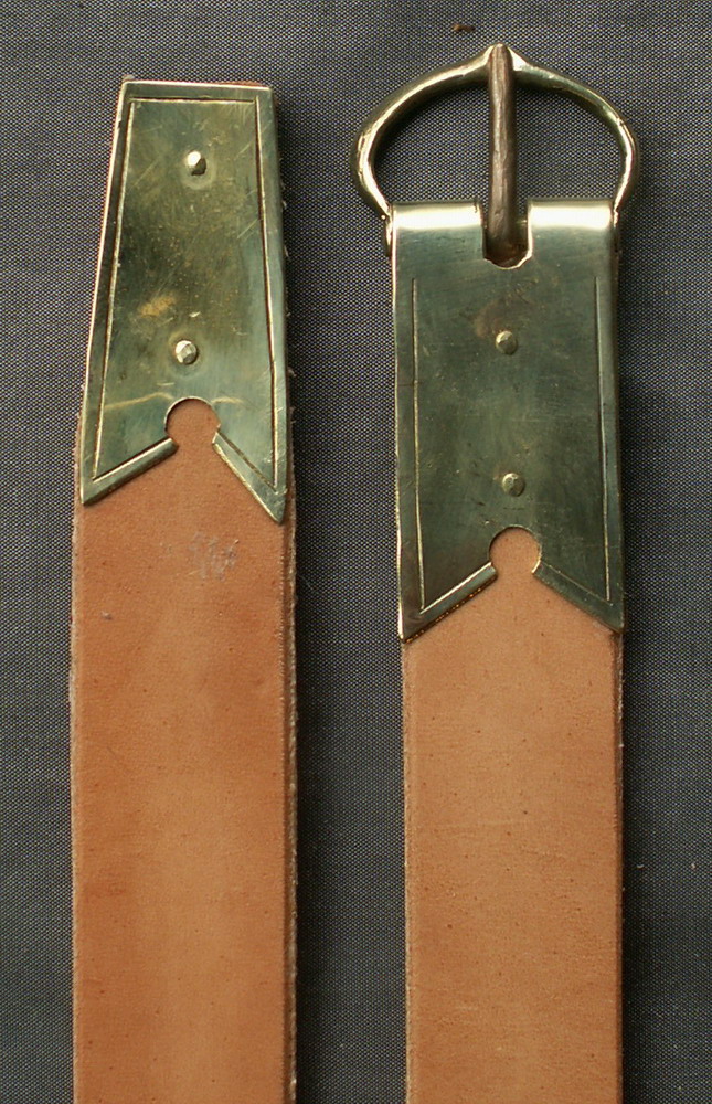 This is a medieval style belt with a tan 7/8 inch (22mm) wide strap. It is 61 inches (155cm) long with a hand made brass buckle plate and strap end. This style of buckle was in common use from 1350 - 1450